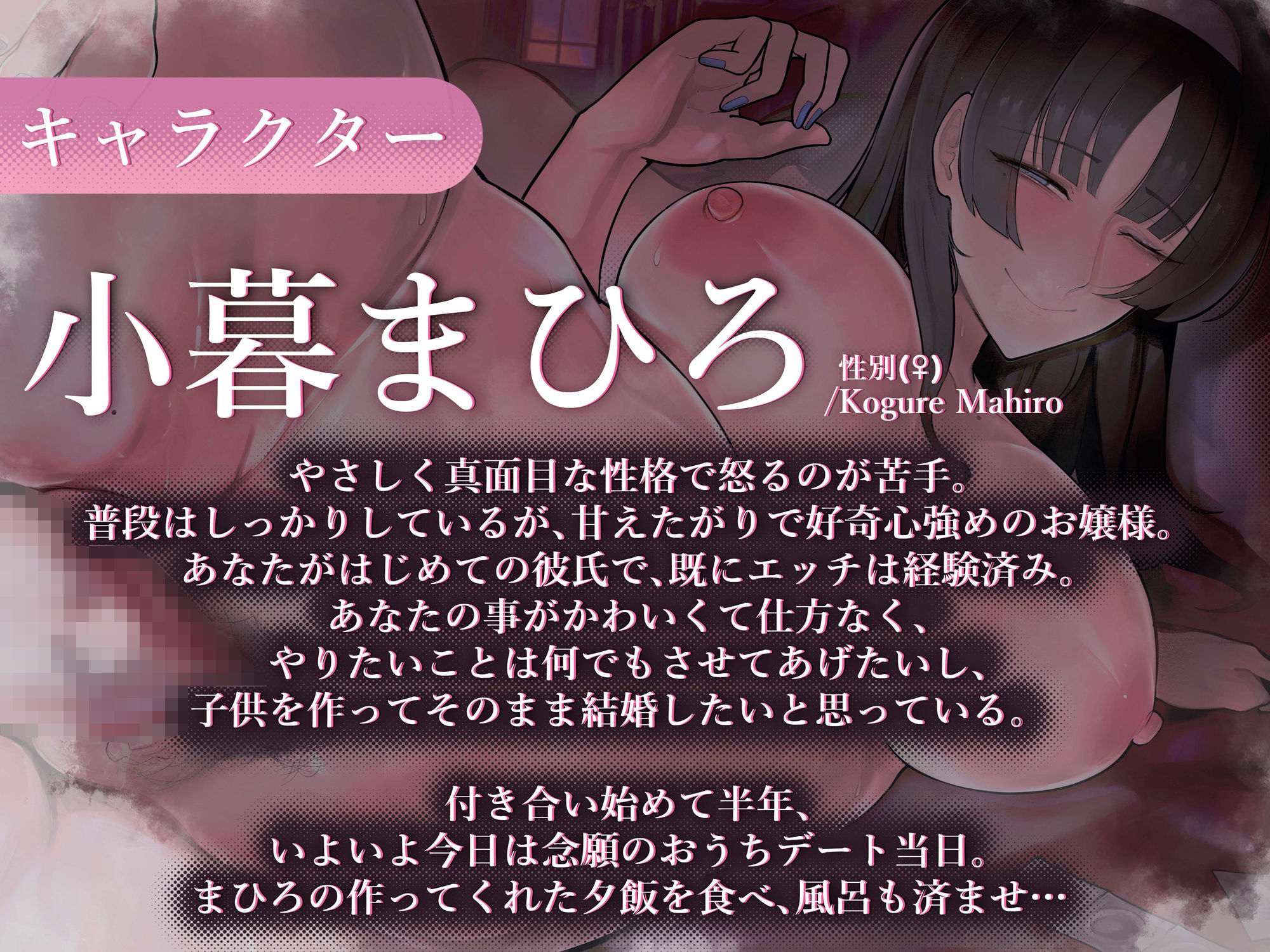 小暮まひろ(♀) やさしく真面目な性格で怒るのが苦手。普段はしっかりしているが、甘えたがりで好奇心強めのお嬢様。あなたがはじめての彼氏で、既にエッチは経験済み。あなたの事がかわいくて仕方なく、やりたいことは何でもさせてあげたいし、子供を作ってそのまま結婚したいと思っている。 付き合い始めて半年、いよいよ今日は念願のおうちデート当日。まひろの作ってくれた夕飯を食べ、風呂も済ませ…